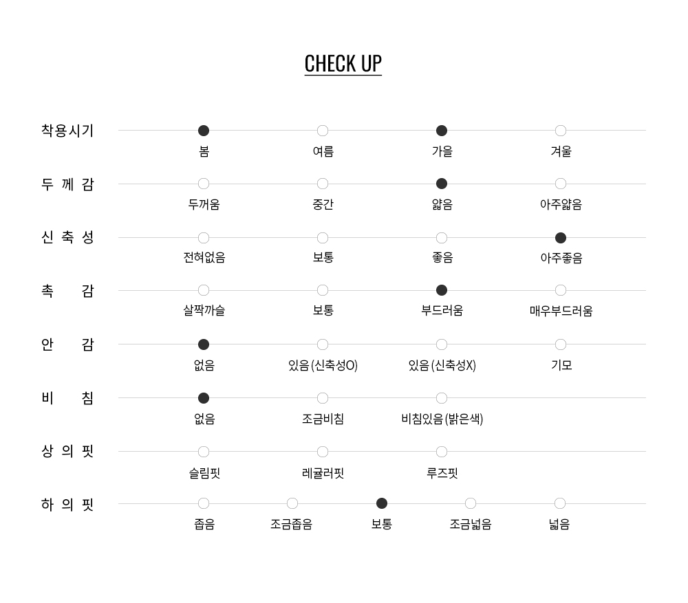 325g/m²(363g/yd) 중량으로 안정적인 두께감을 갖춰 계절 전환기부터 데일리로 활용하기 좋습니다.