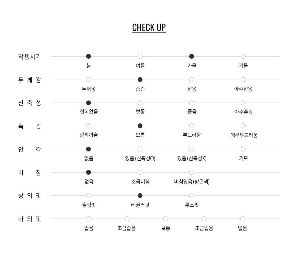 적당한 두께감으로 봄, 가을 시즌 착용하기 좋으며 가먼트 워싱 처리로 면 소재 특유의 뻣뻣함 없이 워싱 특유의 내추럴한 질감과 부드러운 터치감을 느낄 수 있습니다.