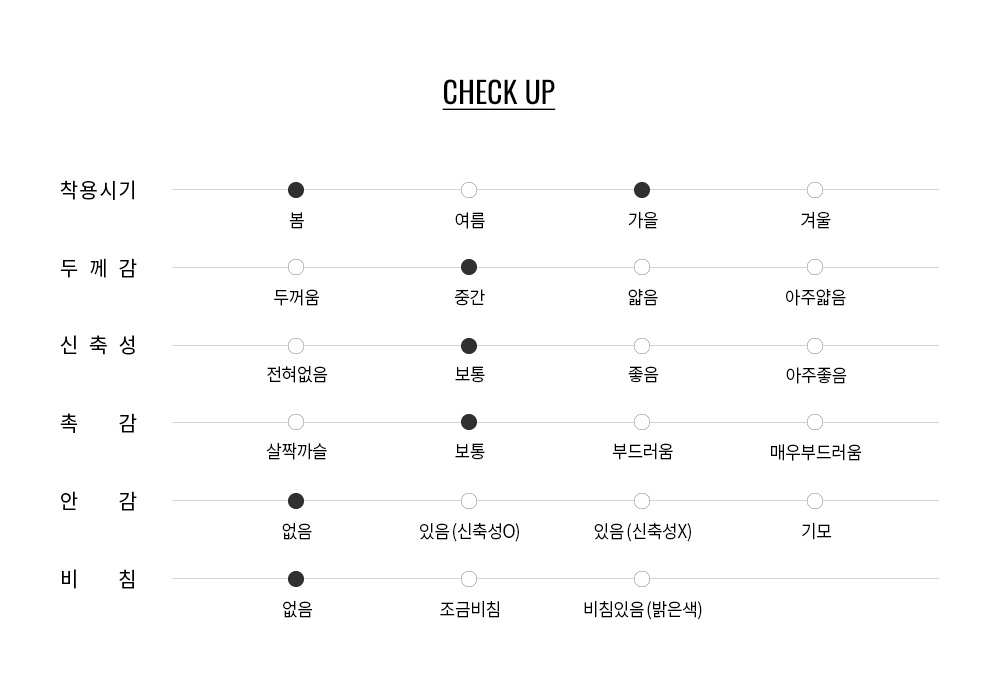 세밀한 원사를 사용하여 밀도 높게 제직 되어 탄탄하고 높은 복원력을 보여주며 스판이 포함되어 있어 뻣뻣하지 않고