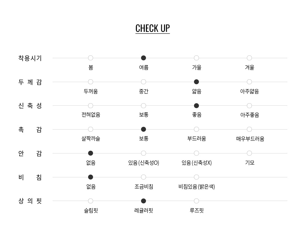 적당한 중량의 텐션감 있는 스판 원단을 사용하여 부드러운 촉감과 우수한 신축성을 선사합니다.