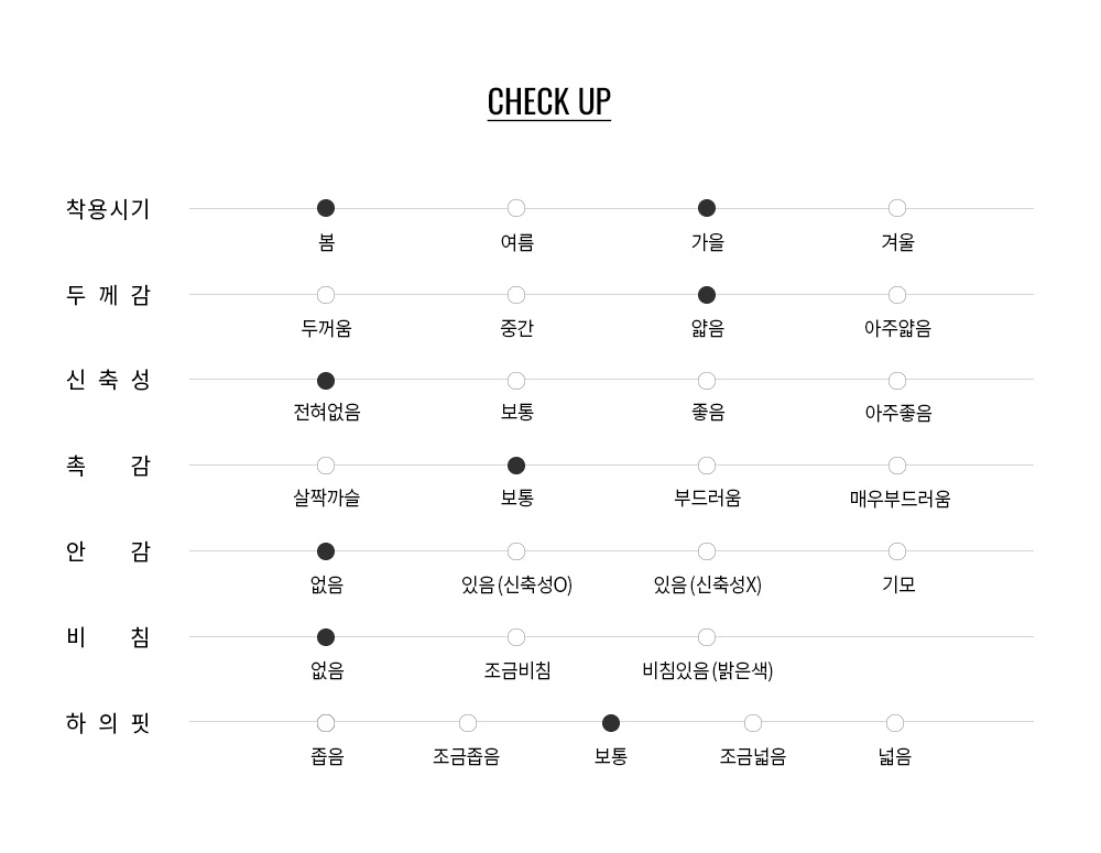 전체적으로 힙부터 밑단까지 H라인으로 떨어지는실루엣으로, 단정하고 슬림한 핏입니다.