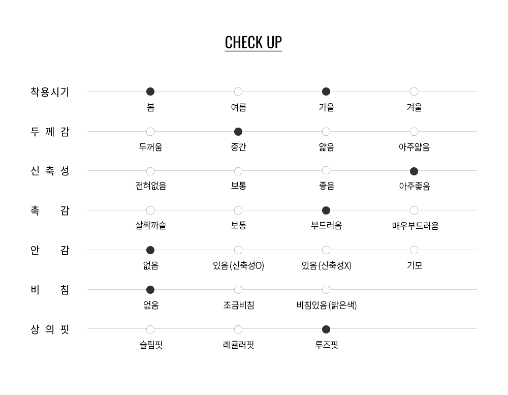 도톰한 두께감으로 FW시즌부터 여전히 쌀쌀한 봄 시즌까지 활용도 높을 아이템입니다.