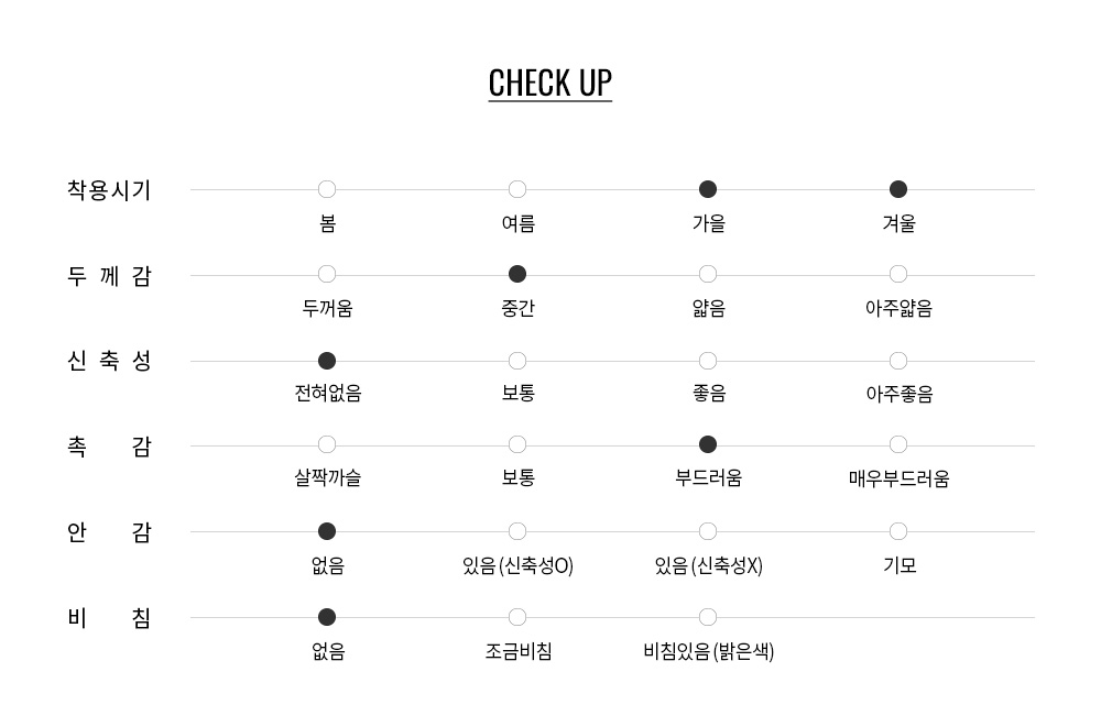 적당한 두께감의 부드러운 촉감으로 편안하고 따뜻한 착용감을 느낄 수 있습니다.