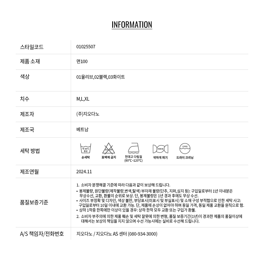 면 100%의 280G/M2의 톡톡한 중량감으로 몸에 달라붙지 않으며 안정감 있는 실루엣을 보여줍니다.